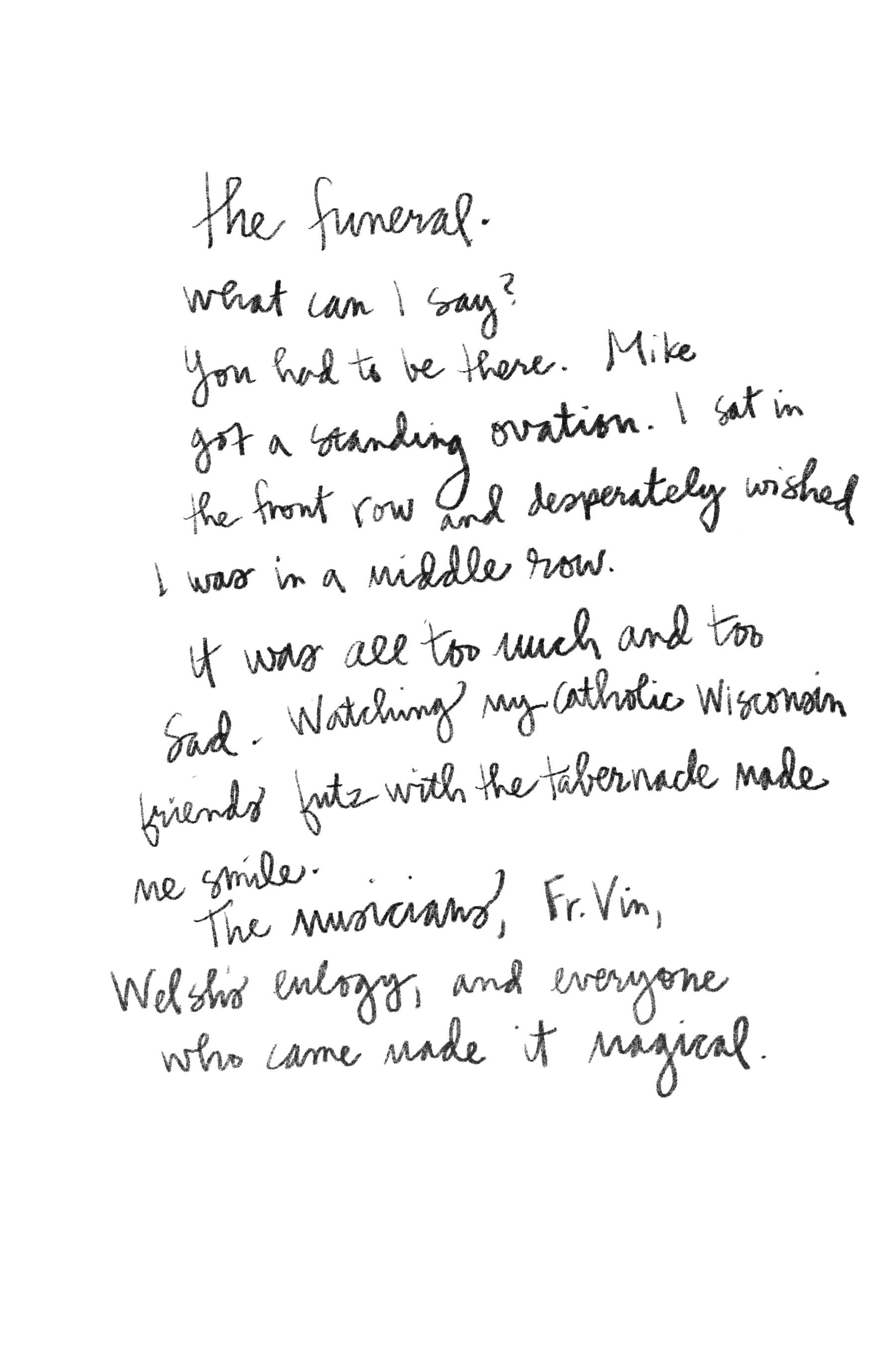 I looked up and saw clouds in the cloudless sky. My brain went from sharp to mush. I went from wanting to live in only the present moment to not caring about the present moment. I continue to fill those first few days with unreliable memories, with nothing special. It was almost like I had already begun to take on his dead weight, almost like my own organs started failing me.